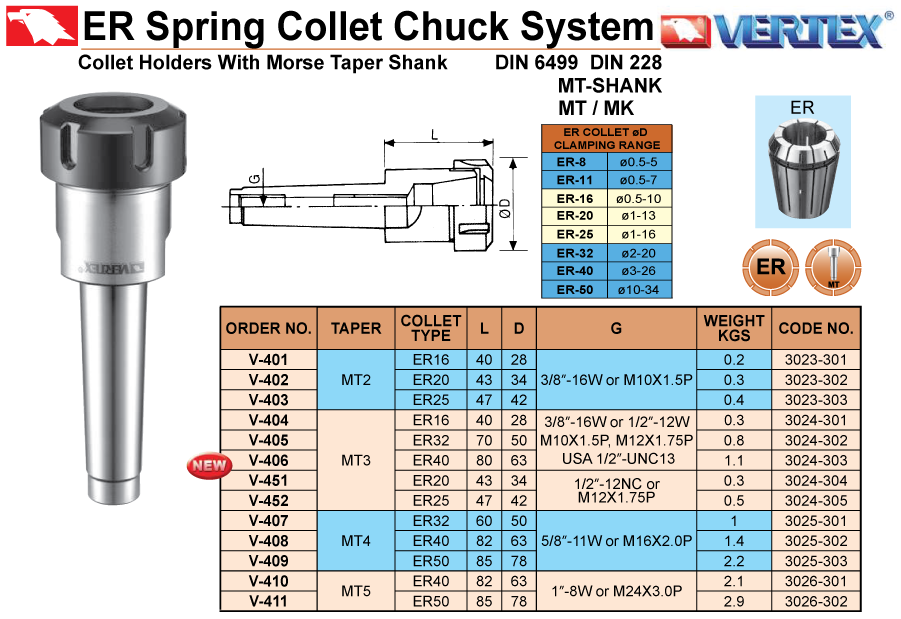 • Bầu kẹp dao phay chuôi côn MT-ER riêng lẻ: V-401;V-402;V-403;V-404;V-405;V-406;V-451;V-452;V-407;V-408;V-409;V-410;V-411