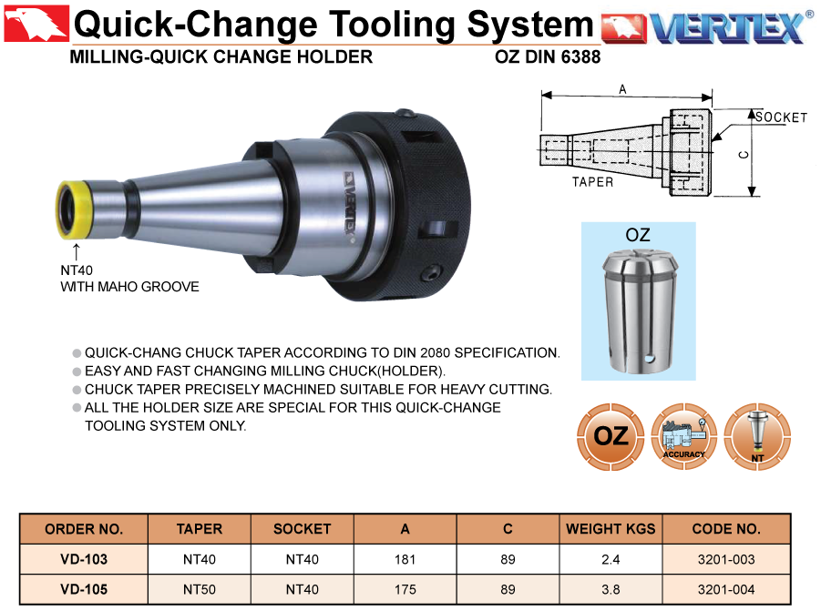 • Bầu kẹp dao collet OZ chuôi NT (Quick change tooling system): VD-103, VD-105