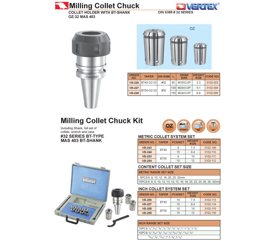 • Bầu Kẹp Dao Collet OZ32 Chuôi BT Vertex (Milling Collet Chuck): VB-226, VB-227, VB-228