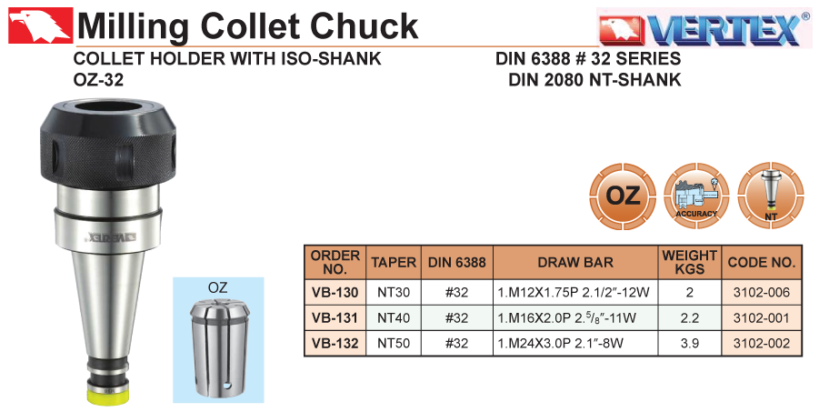 • Bầu kẹp dao collet NT-OZ32 (Milling Collet Chuck) : VB-130, VB-131, VB-132