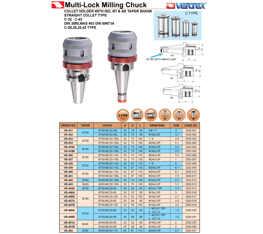 • Bầu kẹp collet trụ C (Multi-lock Milling chuck): VB-431, VB-432, VB-433, VB-434, VB-435A , VB-435B, VB-436, VB-437, VB-438, VB-439, VB-440, VB-441, VB-442, VB-443, VB-444A, VB-446A, VB-446B, VB-447A, VB-447B, VB-448A, VB-448B, VB-449B, VB-451A, VB-451B, VB-452