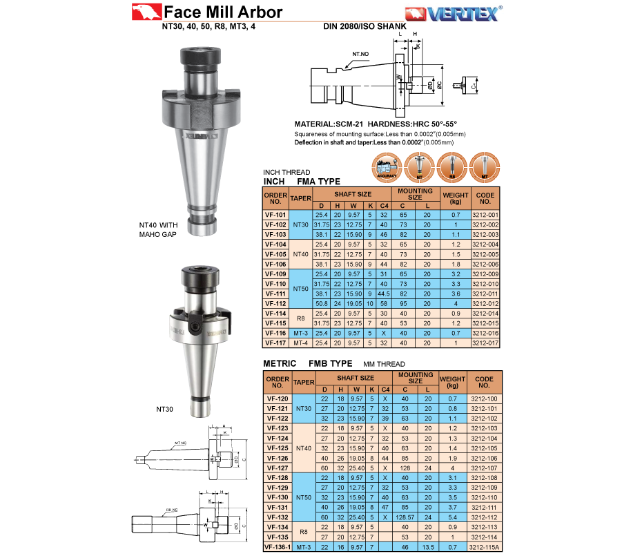 • Bầu kẹp dao phay khỏa mặt Vertex (Face Mill Arbor) sử dụng kẹp đài dao phay khỏa mặt.