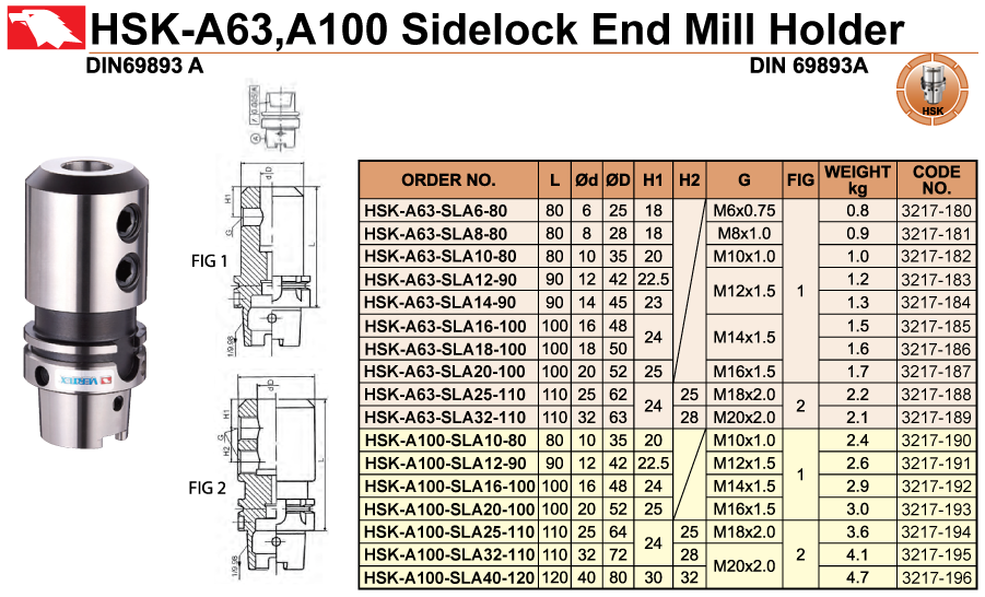 • Bầu Kẹp Dao Phay Sidelock Chuôi HSK-A63, HSK-A100-SLA (HSK-A63,A100 Sidelock End Mill Holders) HSK-A63-SLA6-80, HSK-A63-SLA8-80, HSK-A63-SLA10-80, HSK-A63-SLA12-90, HSK-A63-SLA14-90, HSK-A63-SLA16-100, HSK-A63-SLA18-100, HSK-A63-SLA20-100, HSK-A63-SLA25-110, HSK-A63-SLA32-110, HSK-A100-SLA10-80, HSK-A100-SLA12-90, HSK-A100-SLA16-100, HSK-A100-SLA20-100, HSK-A100-SLA25-110, HSK-A100-SLA32-110, HSK-A100-SLA40-120