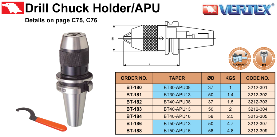 • Bầu kẹp mũi khoan BT-APU (Drill chuck holder/APU) : BT-180, BT-181, BT-182, BT-183, BT-184, BT-186, BT-188