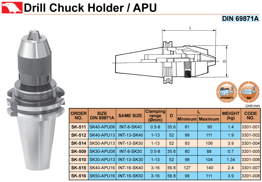 • Bầu kẹp mũi khoan kiểu SK-APU Vertex (Drill Chuck Holder/APU) model SK-511, SK-512, SK-514, SK-509, SK-510, SK-515, SK-516