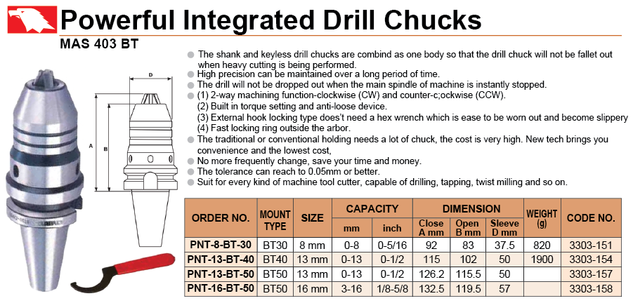 - Bầu Kẹp Mũi Khoan Lực Siết Mạnh PNT Vertex (Powerful Integrated Drill Chucks) PNT-8-BT-30, PNT-13-BT-40, PNT-13-BT-50, PNT-16-BT-50