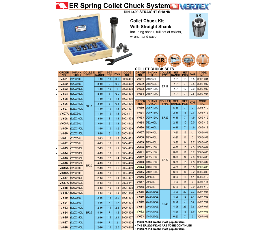 • Bộ bầu kẹp dao phay chuôi trụ ER đầy đủ: V-601, V-602, V-603, V-604, V-605, V-606, V-607, V-607A, V-608, V-608A, V-609, V-610, V-611, V-612, V-613, V-614, V-615, V-615A, V-616, V-616A, V-617, V-617A, V-618, V-618A, V-619, V-621, V-622, V-624, V-625, V-627, V-628, V-681, V-682, V-683, V-684, V-630, V-631, V-633, V-634, V-636, V-637, V-638, V-639, V-640, V-641, V-642, V-643, V-644, V-645, V-646, V-647, V-648, V-658, V-659, V-660, V-661, V-662, V-663