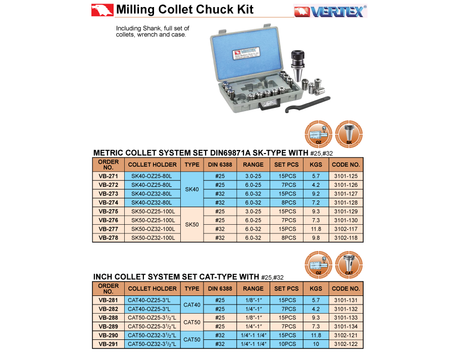 • Bộ bầu kẹp SK, CAT -OZ đầy đủ (Milling collet chuck kit) : VB-271, VB-272, VB-273, VB-274, VB-275, VB-276, VB-277, VB-278, VB-281, VB-282, VB-288, VB-289, VB-290, VB-291
