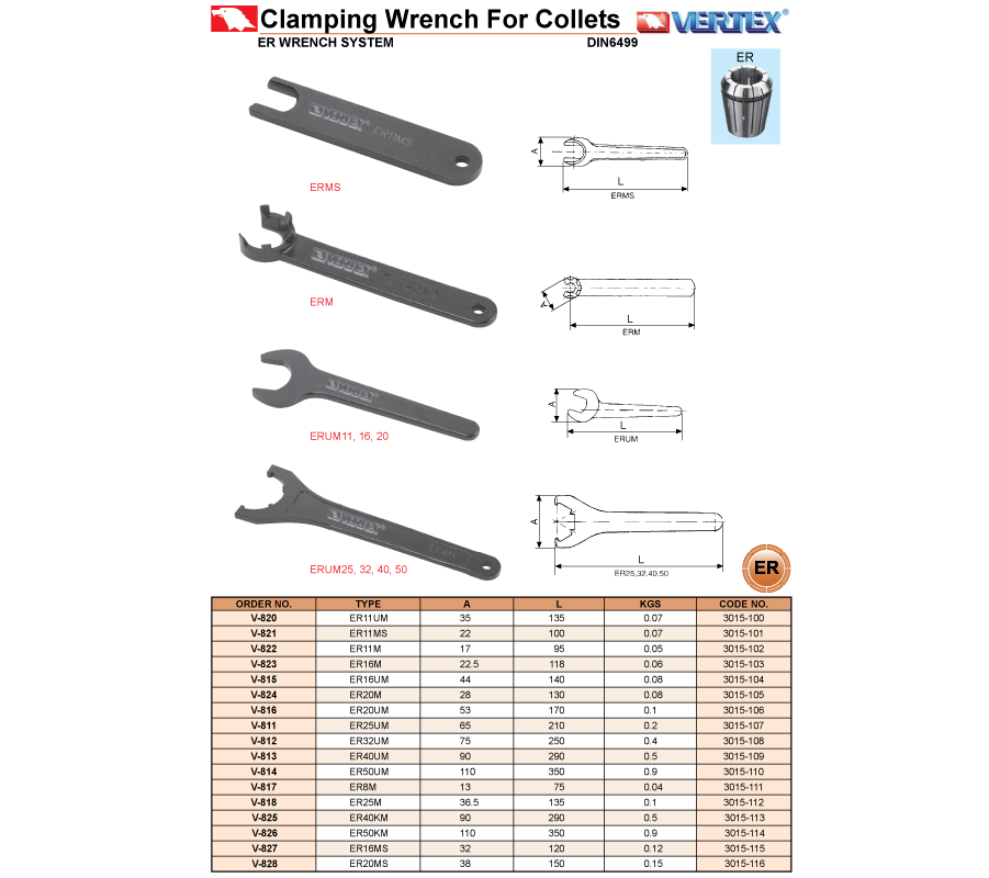 • Chìa Vặn Bầu Kẹp Collet ER Vertex (Clamping Wrench For Collets) model V-820, V-821, V-822, V-823, V-815, V-824, V-811, V-812, V-813, V-814, V-817, V-818, V-825, V-826, V-827, V-828