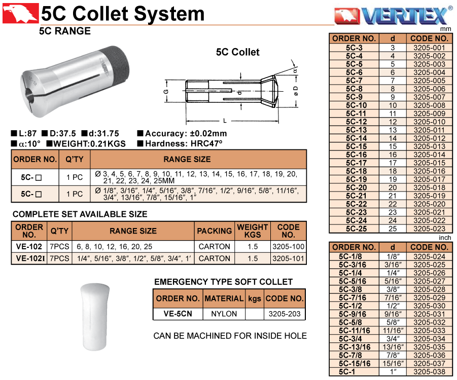 • 5C Collet System model (Hệ mm): 5C-3, 5C-4, 5C-5, 5C-6, 5C-7, 5C-8, 5C-9, 5C-10, 5C-11, 5C-12, 5C-13, 5C-14, 5C-15, 5C-16, 5C-17, 5C-18, 5C-19, 5C-20, 5C-21, 5C-22, 5C-23, 5C-24, 5C-25. (Hệ inch) : 5C-1/8, 5C-3/16, 5C-1/4, 5C-5/16, 5C-3/8, 5C-7/16, 5C-1/2, 5C-9/16, 5C-5/8, 5C-11/16, 5C-3/4, 5C-13/16, 5C-7/8, 5C-15/16, 5C-1