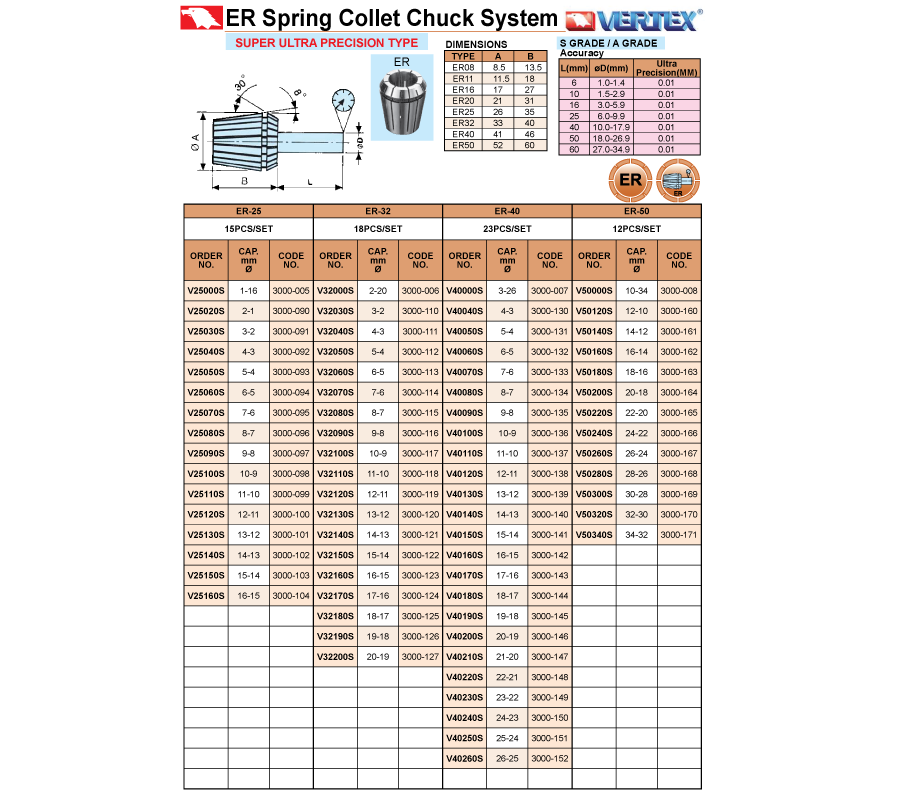 • Collet ER loại siêu chính xác Vertex bao gồm đủ các kiểu size ER từ loại ER-8 cho đến ER-50, kẹp được các chi tiết từ phi 0.5 cho đến phi 32 tùy vào size của collet. (model phần đuôi có thêm chữ S. VD: V-08000S~V-50000S)