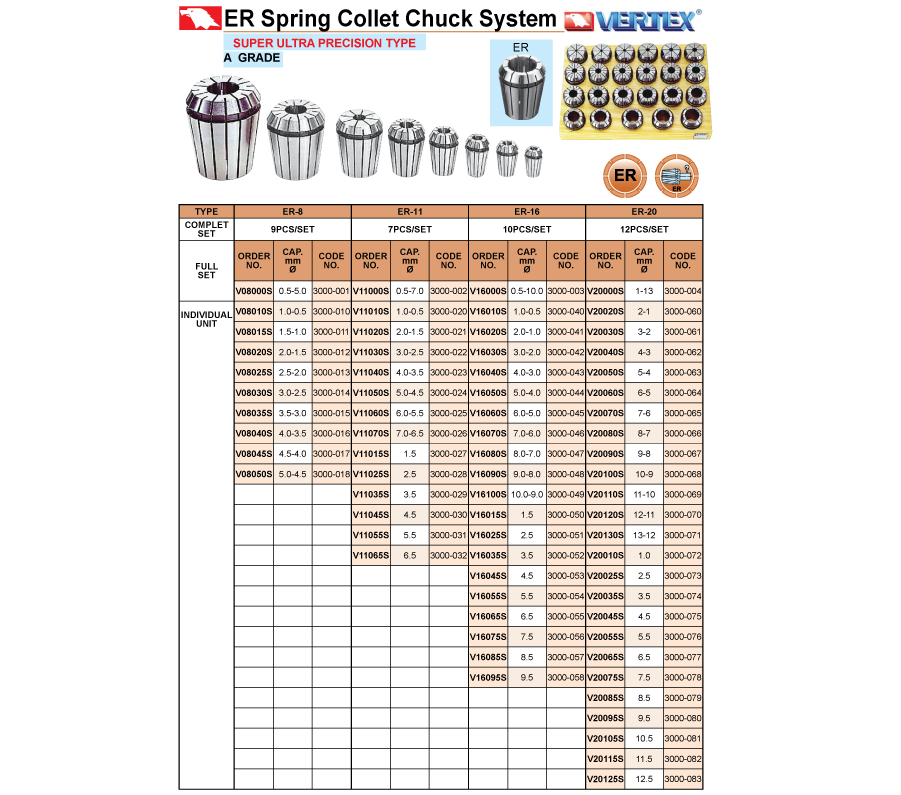 • Hệ thống ống kẹp ER của VERTEX được làm bằng vật liệu thép đàn hồi đặc biệt dưới nhiệt độ tuyệt vời và quy trình mài chính xác, vì vậy nó có độ chính xác chính xác, khả năng kẹp mạnh mẽ và bền.