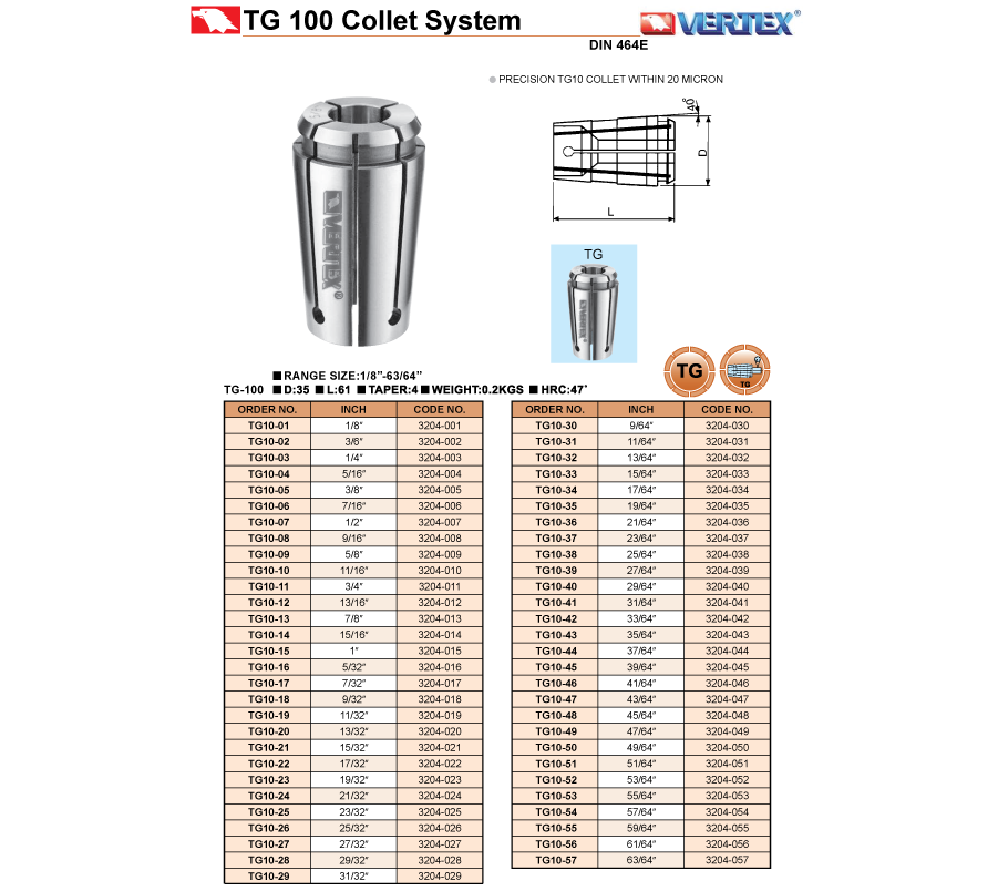 • TG100 Collet System model TG10-01; TG10-02; TG10-03; TG10-04; TG10-05; TG10-06; TG10-07; TG10-08; TG10-09; TG10-10; TG10-11; TG10-12; TG10-13; TG10-14; TG10-15; TG10-16; TG10-17; TG10-18; TG10-19; TG10-20; TG10-21; TG10-22; TG10-23; TG10-24; TG10-25; TG10-26; TG10-27; TG10-28; TG10-29, TG10-30; TG10-31; TG10-32; TG10-33; TG10-34; TG10-35; TG10-36; TG10-37; TG10-38; TG10-39; TG10-40; TG10-41; TG10-42; TG10-43; TG10-44; TG10-45; TG10-46; TG10-47; TG10-48; TG10-49; TG10-50; TG10-51; TG10-52; TG10-53; TG10-54; TG10-55; TG10-56; TG10-57