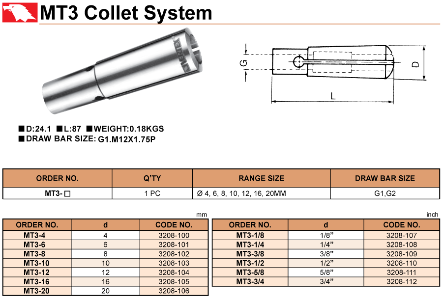 • Collet MT3 có đầy đủ các size mở được từ 4mm đến 20mm
