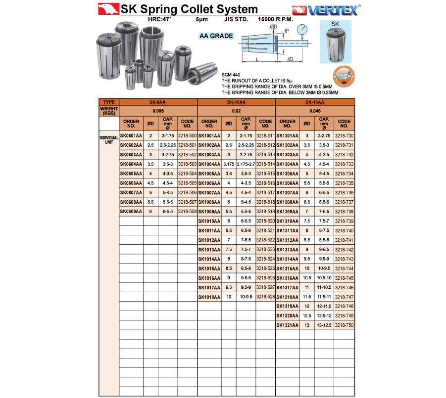 • Khoảng kẹp của các collet SK : đường kính trên 3mm là 0.5mm; đường kính dưới 3mm là 0.25mm.