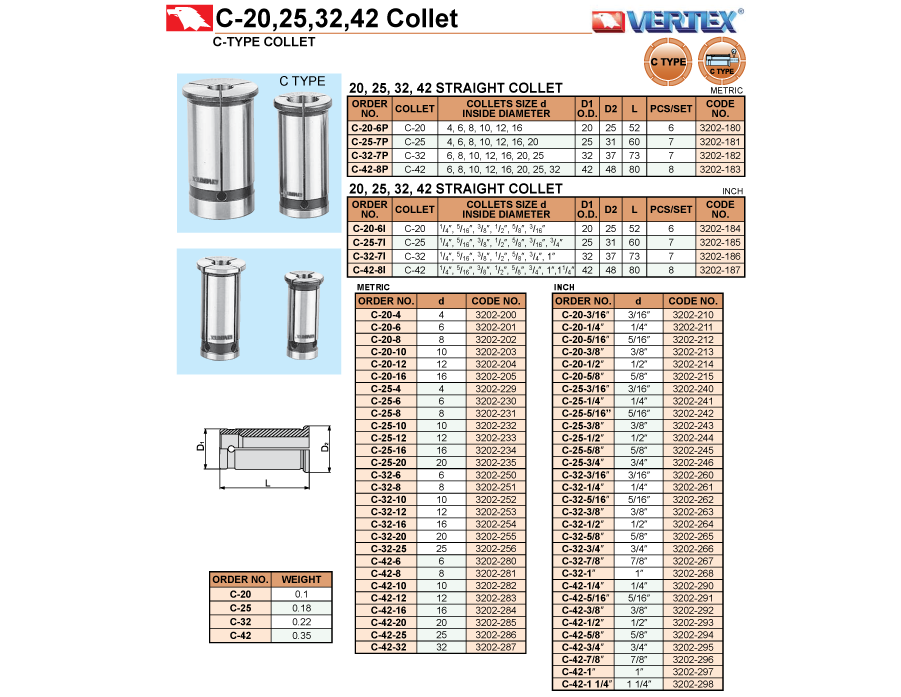 • Bảng bộ collet trụ C-32, C-42, C-20, C-25 (bao gồm cả bộ, đơn lẻ, hệ Met, Inch): C-20-6P, C-25-7P, C-32-7P, C-42-8P, C-20-6I, C-25-7I, C-32-7I, C-42-8I