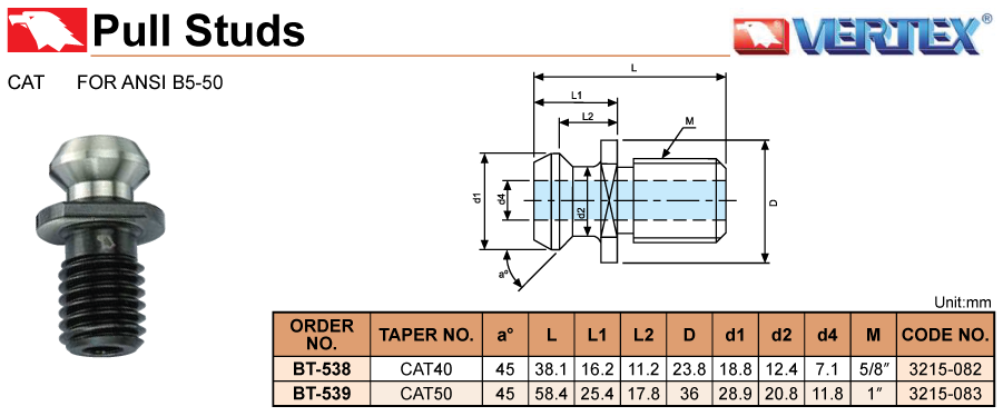 • Pull Stud CAT For ANSI B5-50 model BT-538, BT-539
