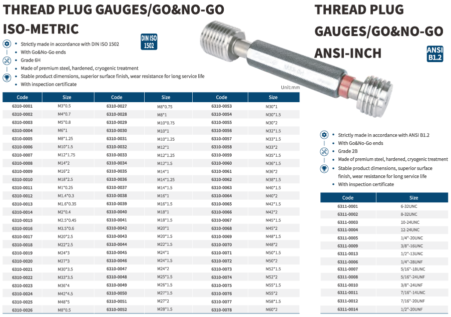 • Hệ inch size: 6-32UNC,  8-32UNC,  10-24UNC,  12-24UNC,  1/4"-20UNC,  3/8"-16UNC,  1/2"-13UNC,  1/4"-28UNF,  5/16"-18UNC,  5/16"-24UNF,  3/8"-24UNF,  7/16"-14UNC,  7/16"-20UNF,  1/2"-20UNF.