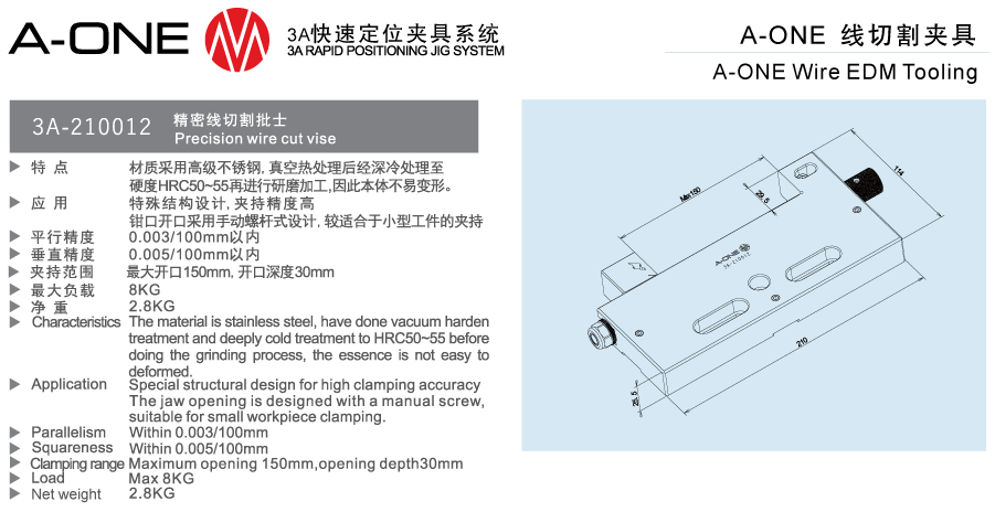 - A-one 3A-210012 là dòng ê tô kẹp phôi tiêu chuẩn cao, được thiết kế đặc biệt cho các máy cắt dây EDM (Wire Electrical Discharge Machining). Sản phẩm là một phần trong hệ thống định vị nhanh (Zero Point System) của A-one, giúp tối ưu hóa thời gian gá đặt và đảm bảo độ chính xác lặp lại tuyệt đối trong môi trường gia công ngập nước hoặc dầu điện môi.