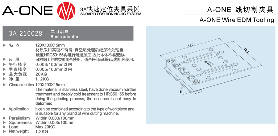 • A-one 3A-210028 (Binary fixture) là một thiết bị gá kẹp vạn năng (Universal Base) thuộc hệ thống giải pháp gá đặt nhanh của thương hiệu A-one danh tiếng. Sản phẩm được thiết kế đặc thù để làm việc trong môi trường khắc nghiệt của máy cắt dây (WEDM) và máy xung điện (EDM), nơi yêu cầu độ chính xác cực cao và khả năng chống ăn mòn tuyệt đối.