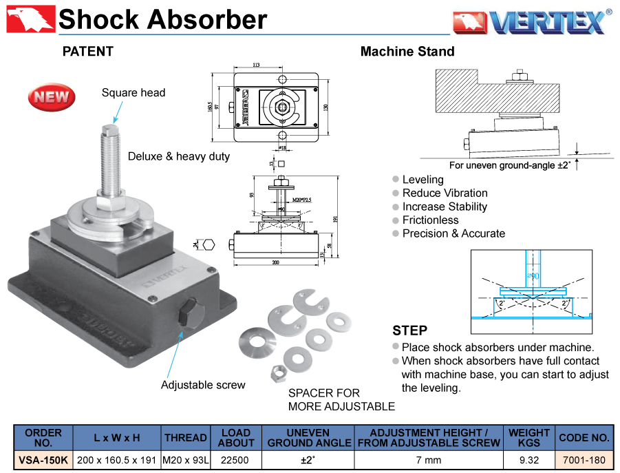 • Thiết bị VSA-150K có nhiều miếng đệm để hỗ trợ cho việc giảm chấn, giảm rung động, mặt khác nó được điều chỉnh bằng đai ốc rất dễ dàng cho người sử dụng.